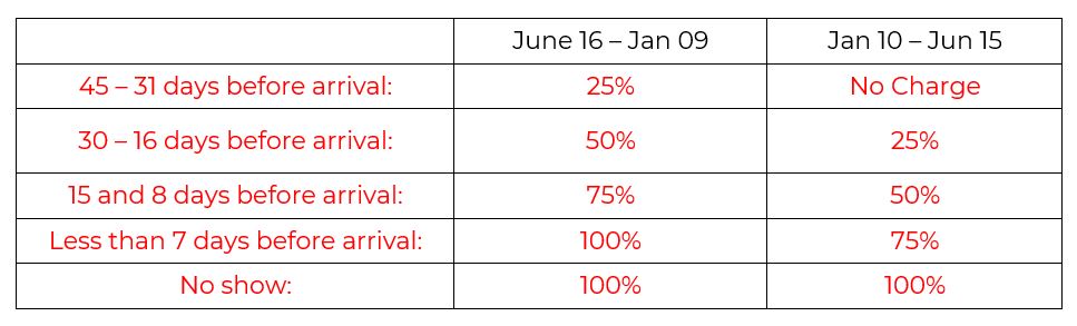 Cancellation Policy: In case of cancellation the policy below applies to all reservations:
